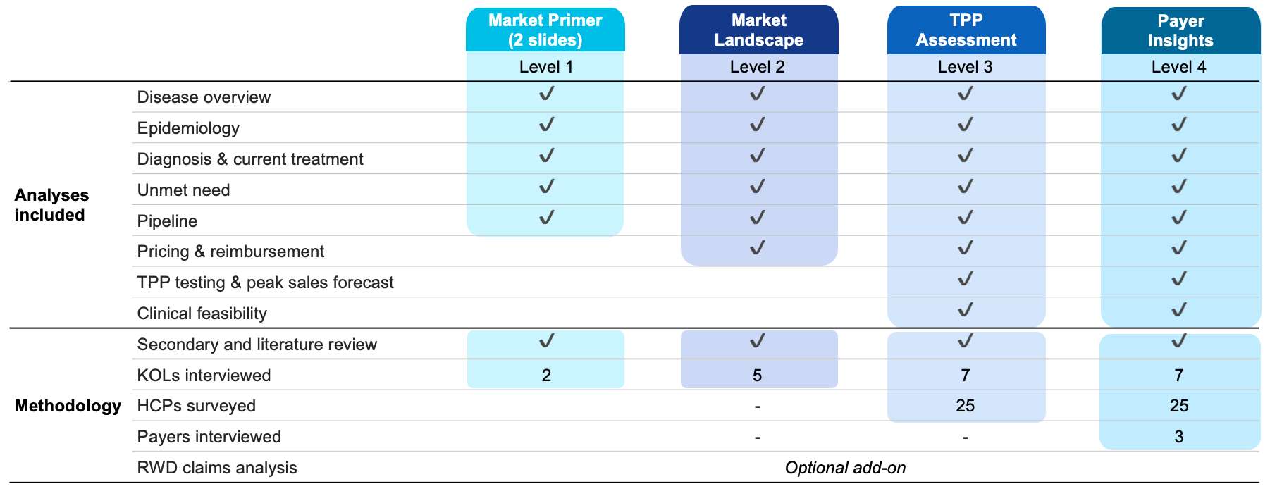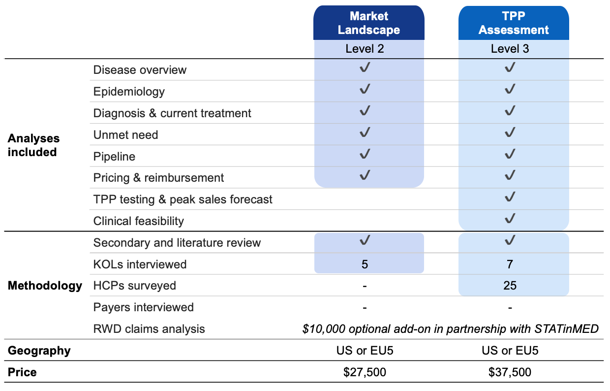 Our insight rich and highly visual reports cover key market dynamics based on research from key opinion leader (KOL) interviews, physician surveys, and secondary data. REACH’s analysts distill critical market insights for any disease, so you don’t have to. You tell us the disease, and our team will create and deliver a MarketVue® in as little as 4 weeks.